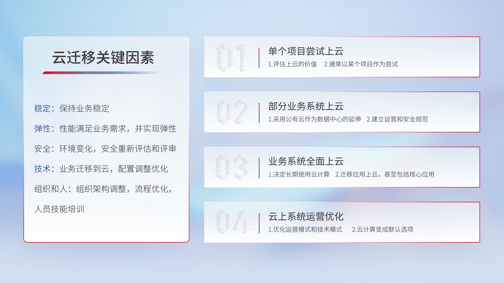 结合实际业务,,从规划设计、、云平台选型、、、、云原生改造、、、、数据迁移、、、、集成交付,,迁移全过程为客户识别最佳上云路径,,,做好风险识别管理,,,,设计网络架构、、、、身份权限、、、、安全审计合规、、操作审计、、、日志审计、、、监控告警策略、、、多站点容灾设计等,,,,对云上基础设施进行整体规划,,,,提升IT治理水平,,,,以满足弹性、、、高可用、、、高性能的需求。。。