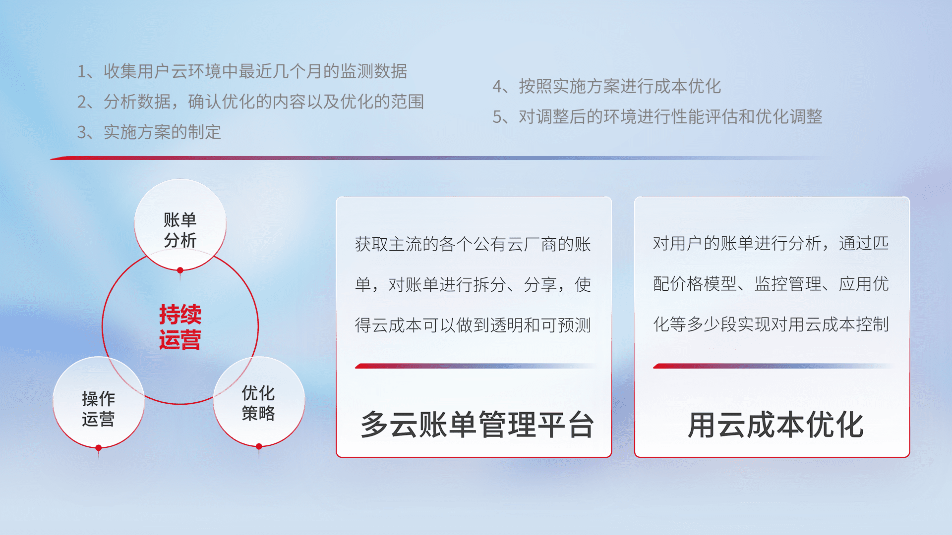 通过多云纳管,,以统一的资源数据模型把客户的云资源进行抽象和封装,,,进而实现对多云资源的统一操作,,保障云资源管理的可靠性、、稳定性与可用性。。。量身定制化运维内容,,,,配置、、、、开发运维、、、补丁管理、、备份、、监控、、认证和访问管理、、、审计和日常巡检等,,,,保障在用云过程中的可靠度,,,,稳定度以及高可用率。。。。